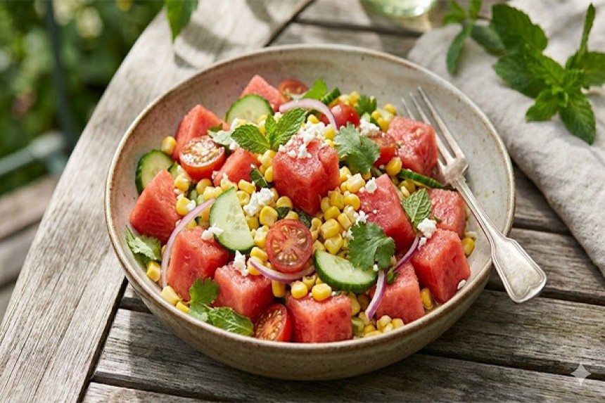 तरबूज और मक्के के दानों से बना यह सलाद शरीर को ठंडा रखेगा और आपकी जीभ को भी एक अनोखा और मसालेदार स्वाद देगा।
