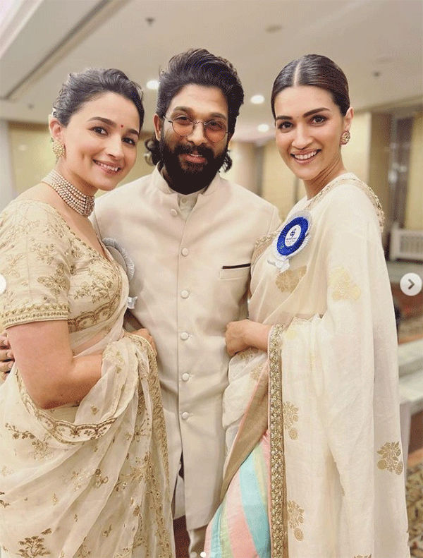 आलिया भट्ट को 'गंगूबाई काठियाबाड़ी' के लिए और कृति सेनन को 'मिमी' के लिए बेस्ट एक्ट्रेस का अवॉर्ड मिला। इसके साथ ही अल्लू अर्जुन (Allu Arjun) को 'पुष्पा' के लिए बेस्ट एक्टर का अवॉर्ड मिला। अल्लू तेलुगू इंडस्ट्री के पहले स्टार हैं, जिन्हें ये अवॉर्ड मिला है। अपनी जिंदगी के इस स्पेशल डो को तीनों ने कुछ तस्वीरें खिंचवाकर क्लिक सेलिब्रेट किया। तीनों ने एक दूसरे के लिए खूबसूरत मैसेज भी लिखा, जिसने फैंस का दिल जीत लिया है।