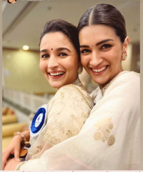 आलिया भट्ट ने कृति सेनन के साथ फोटो शेयर कर उन्हें बधाई दी। उन्होंने लिखा, 'कॉन्गरैचुलेशन्स मिमी...कल हम लोगों ने जो मोमेंट बिताया उससे हमारा दिन बहुत स्पेशल था। आपको बहुत सारा प्यार। मुझसे जल्दी मिलो ताकी रणबीर हमारी बहुत सी फोटो क्लिक करा सके।' आलिया के मैसेज पर कृति ने उनके लिए स्वीट मैसेज लिखा और फैंस को बताया कि दोनों की बड़ी सी स्माइल वाली इस फोटो को रणबीर कपूर ने क्लिक किया है।