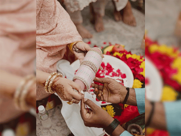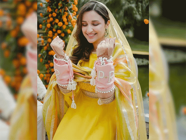 परिणीति चोपड़ा की इन तस्वीरों में वो अपने परिवार और दोस्तों के साथ रिवाजों को निभाते दिखीं. खास बात है कि चूड़ा के ऊपर एक्ट्रेस ने जो पिंक कलर का कपड़ा लपेटा है उसके ऊपर लिखा है- 'पी आर...यानी कि परिणीति और राघव.'
