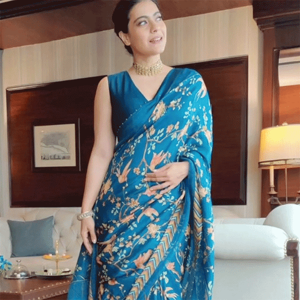 रॉयल ब्लू कलर में काजोल का लुक बेहद डिफरेंट लग रहा है. उन्होंने साड़ी को प्लंजिंग नेकलाइन वाले स्लीवलेस ब्लाउज के साथ कैरी किया है. एक्ट्रेस का लाइट मेकअप लुक को कंपलीट करता दिख रहा है.