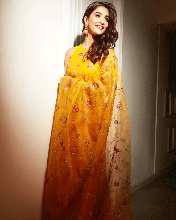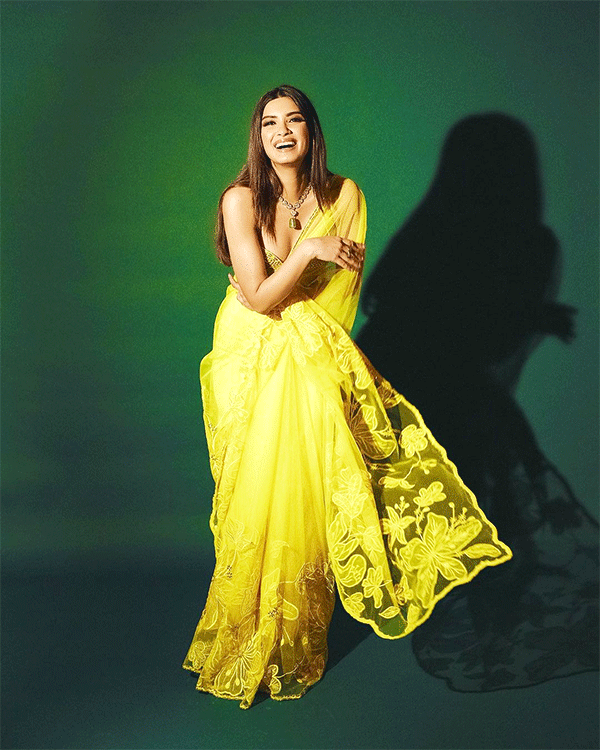 हल्दी फंक्शन के लिए आप इस फ्लोरल साड़ी लुक को जरूर ट्राई कर सकती हैं। एक्ट्रेस पूजा हेगड़े द्वारा पहनी गई ये साड़ी हल्दी के लिए बेस्ट ऑप्शन है। इस साड़ी में नाजुक रंगीन फूलों की कढ़ाई है।