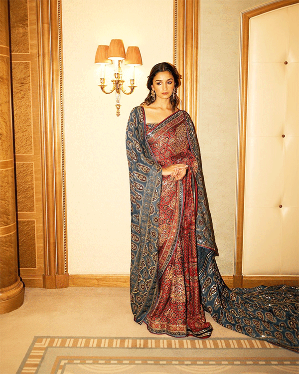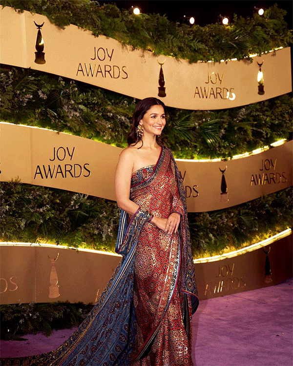 आलिया ने पारंपरिक ब्लाउज को छोड़कर मैचिंग अजरख-प्रिंटेड ट्यूब टॉप (Ajrakh-printed tube top) चुना, जिससे उनकी साड़ी लाइमलाइट चुराने में कामयाब रही। बॉलीवुड सनसनी आलिया भट्ट जो अक्सर सभी को रोमांचित कर देती हैं, हाल ही में सऊदी अरब के रियाद में जॉय अवार्ड्स 2024 में रेड कार्पेट पर जलवा बिखेरा। भारतीय संस्कृति और शिल्प का जश्न मनाने के प्रति अपने झुकाव के लिए प्रसिद्ध, आलिया ने सिर्फ एक नहीं बल्कि दो पारंपरिक भारतीय साड़ियाँ पहनीं।