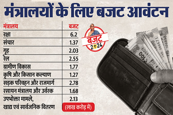 वित्त मंत्री निर्मला सीतारमण (Nirmala Sitharaman) ने संसद में अंतरिम बजट पेश (interim budget presented) कर दिया। बजट पेश करते हुए वित्त मंत्री ने कहा कि सरकार की योजनाओं के केंद्र में गरीब, युवा, महिला और अन्नदाता हैं। बजट में कृषि, स्वास्थ्य, रक्षा, रेल, अधोसंरचना समेत सभी क्षेत्रों का लिए के लिए कई एलान हुए। बजट में कई अहम मंत्रालयों के लिए आवंटन भी किया गया।