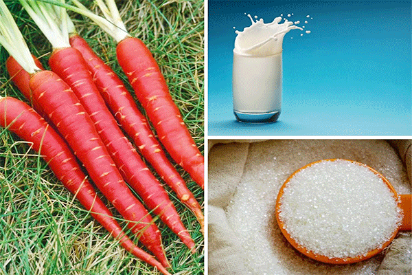 गाजर, आधा कप चीनी, आधा कप दूध, इलायची पाउडर, घी, दूध पाउडर, सूखे मेवे