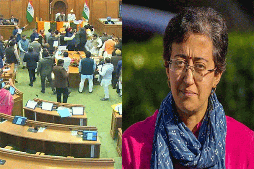 इस पर आम आदमी पार्टी विधायक मुकेश अहलावत ने सदन को बताया कि वह गोवा चली गई हैं। इस अध्यक्ष ने कहा कि कल वह प्रदूषण पर चर्चा की मांग कर रही थीं और आज गोवा चली गईं। यह गंभीर मामला है। हंगामा जारी रहने पर सदन की कार्यवाही पूरे दिन के लिए स्थगित कर दी गई। इससे पहले कैबिनेट मंत्री मनजिंदर सिंह सिरसा, विधायक अरविंदर सिंह लवली और विधायक तरविंदर सिंह मारवाह ने आतिशी पर गुरु तेग बहादुर के अपमान का आरोप लगाते हुए कहा कि उन्हें माफी मांगनी चाहिए।