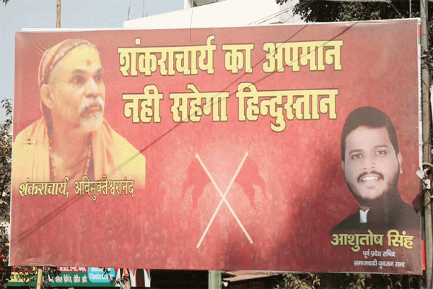लखनऊ : प्रयागराज माघ मेले (Prayagraj Magh Mela) में ज्योतिष पीठ के शंकराचार्य स्वामी अविमुक्तेश्वरानंद सरस्वती की पालकी रोके जाने को लेकर घटित घटना के विरोध में समाजवादी पार्टी (सपा) मैदान में उतर आई है। पार्टी कार्यालय के बाहर अविमुक्तेश्वरानंद (Shankaracharya Swami Avimukteshwaranand Saraswati) के समर्थन में समाजवादी छात्रसभा के पूर्व प्रदेश सचिव आशुतोष सिंह ने पोस्टर लगाया है। पोस्टर पर 'शंकराचार्य का अपमान, नही सहेगा हिंदुस्तान' लिख कर समर्थन दिया है। वहीं समाजवादी पार्टी के राष्ट्रीय अध्यक्ष अखिलेश यादव (Samajwadi Party national president Akhilesh Yadav) शंकराचार्य अविमुक्तेश्वरानंद को लेकर लगातार भाजपा सरकार पर हमलावर हैं। भाजपा को घेरने के लिए अखिलेश यादव कोई मौका नही चूक रहे हैं। अभी दो दिन पहले ही फोन पर शंकराचार्य से बात कर उनकी लड़ाई को आगे बढ़ाने की बात कही गई थी। इसी क्रम में विधानसभा में नेता प्रतिपक्ष माता प्रसाद पांडेय ने शंकराचार्य से प्रयागराज माघ मेले में मुलाकात की थी।