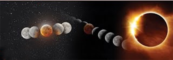 जब पृथ्वी, सूरज और चांद के बीच आ जाती है और सूरज की रोशनी धरती के एटमॉस्फियर से होते हुए चांद पर पड़ती है, तो चांद का रंग लाल-लाल दिखने लगता है, जिसे खग्रास चंद्र ग्रहण (total lunar eclipse) कहते हैं।