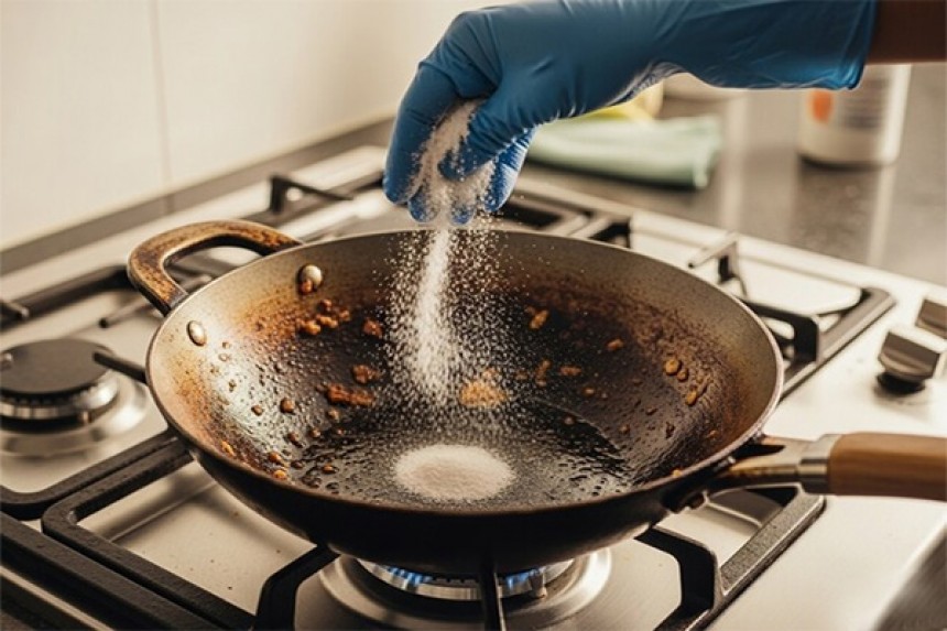 मोटी और जली हुई परत हटाने के लिए, एक तवा या कढ़ाई को थोड़ा गर्म करें। इसमें थोड़ा शैम्पू और मोटा नमक डालें। थोड़ा पानी डालें और इस मिक्सचर को 5-7 मिनट तक उबलने दें। आखिर में, नींबू का रस डालें और आंच बंद कर दें। 10 मिनट बाद, पानी निकाल दें और उसी नींबू के छिलके से रगड़ें। शैम्पू और नींबू जली हुई परत को नरम करते हैं और स्टील स्क्रबर से रगड़ने पर यह तुरंत निकल जाती है।