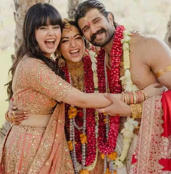इस फोटो में विजय और रश्मिका एक-दूसरे को कसकर गले लगाए हुए हैं। यह दूल्हा-दुल्हन की एंट्री की फोटो है, जिसमें मेहमान नए जोड़े पर फूल बरसाते दिख रहे हैं।