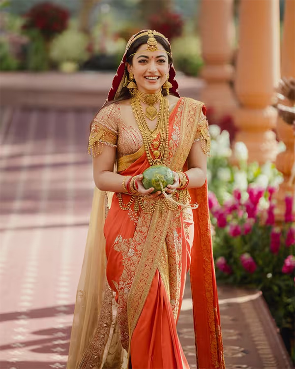 इस फोटो में रश्मिका दुल्हन के रूप में बहुत खूबसूरत लग रही हैं। लाल साड़ी और सोने के गहनों में सजी एक्ट्रेस किसी अप्सरा से कम नहीं लग रही हैं।