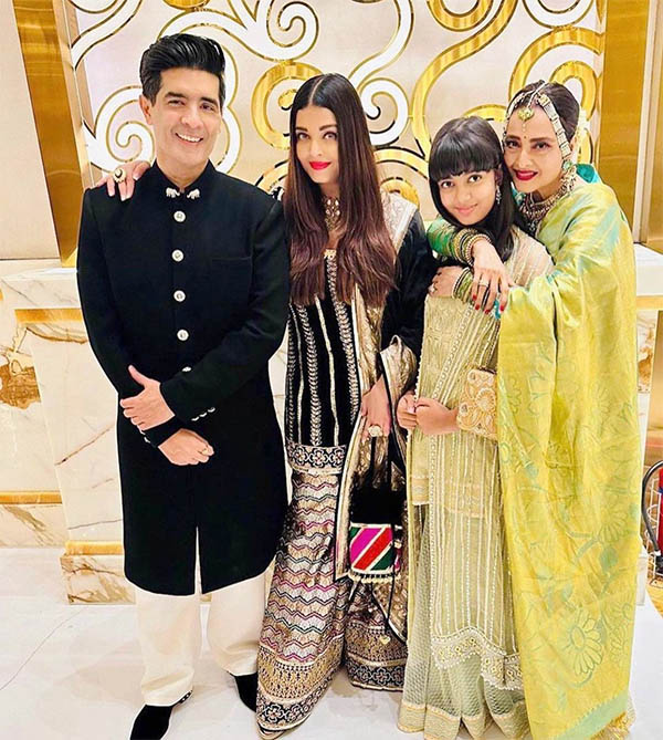 इन फोटोज में ऐश्वर्या, रेखा और आराध्या के साथ-साथ डिजाइनर मनीष मल्होत्रा भी पोज कर रहे हैं. ऐश्वर्या और मनीष तो एक साथ खड़े हुए हैं और रेखा अमिताभ बच्चन और जया बच्चन (Amitabh Bachchan Jaya Bachchan) की पोती आराध्या बच्चन (Aaradhya Bachchan) को गले लगाकर खड़ी हुई हैं. रेखा, ऐश्वर्या और आराध्या की इस बॉन्डिंग ने फैंस को काफी शॉक कर दिया है.