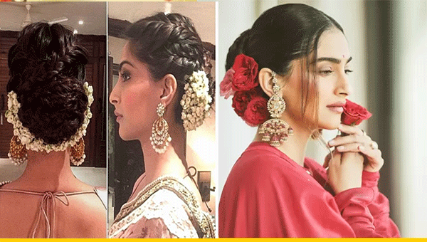 अगर आपके पास गजरा लगाने का समय नहीं है तो आप सोनम कपूर की तरह किसी भी साड़ी या कुर्ते के साथ यह हेयरस्टाइल बना सकती हैं। इसके लिए अपने बालों में भांग का जूड़ा बांध लें और किनारे पर गुलाब का फूल लगाएं। आजकल बाजार में नकली लाल गुलाब यू पिन आसानी से उपलब्ध हैं। आम के आकार के अनुसार फूल लगाएं।