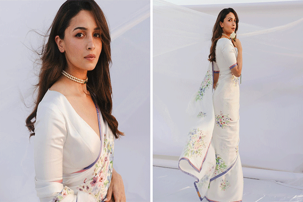 इस साड़ी के साथ आलिया ने गले में मोतियों और पन्ने का एक नाजुक चोकर पहना है और कोई अन्य आभूषण नहीं पहना है। लेकिन फिर भी उनका लुक बेहद रॉयल और अविस्मरणीय है