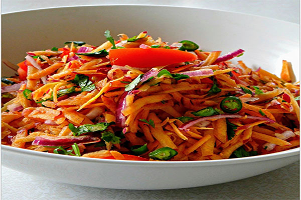 सामग्री: दो बड़ी कद्दूकस की हुई लाल गाजर, थोड़ा सा धनिया, एक बड़ा चम्मच पिसा जायफल, मुट्ठी भर नारियल के टुकड़े, स्वादानुसार चीनी और नमक, तथा थोड़ा सा तेल। विधि: गाजर के एक बैग में सभी सामग्री को अच्छी तरह से मिलाएं। तेल गरम करें, हींग, हल्दी, जीरा, राई और मिर्च को पीसकर मिश्रण में डालें। सलाद तैयार है. (आप सलाद को नींबू के रस की जगह दही से भी बना सकते हैं।)