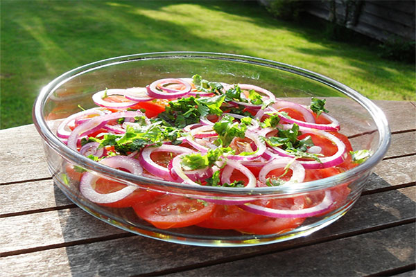 सामग्री: दो मध्यम आकार के पके, बारीक कटे टमाटर, बारीक कटा प्याज, बारीक कटी हरी मिर्च, ताजा मीठा दही, स्वादानुसार नमक और चीनी, जीरा पाउडर, धनिया, घी। छिड़कने के लिए सामग्री। विधि: दही को फेंटें, नमक डालें, इसमें चीनी और जीरा पाउडर डालें और ठंडा होने दें। इसमें प्याज-टमाटर-धनिया डालें और अच्छी तरह मिला लें। एक फ्राइंग पैन में घी गरम करें, उसमें जीरा, राई, हींग, हल्दी और मिर्च डालें, गाढ़ा पेस्ट बनाएं और इसे टमाटर प्याज के मिश्रण में मिला दें। सलाद तैयार है।