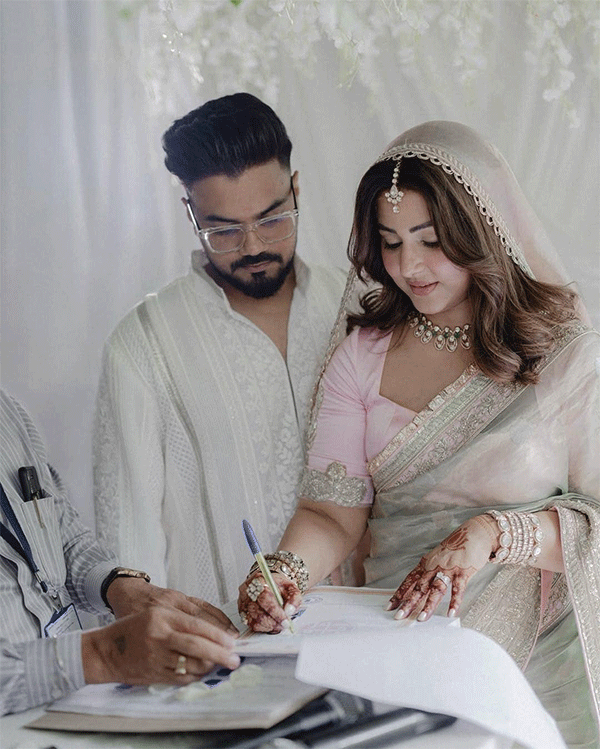 आज जब हिना बीमारी से जूझ रही हैं तो रॉकी उनके साथ एक अटल साथी की तरह खड़े हैं उन्होंने मशहूर डिजाइनर मनीष मल्होत्रा की डिजाइन की हुई नाज़ुक ओपल ग्रीन साड़ी पहनी है।