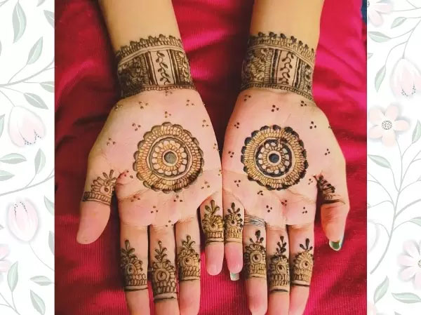 यह डिज़ाइन देखने में साधारण है, लेकिन बेहद आकर्षक है। हाथ के बीचों-बीच मेहँदी से एक बड़ा फूल या गोलाकार डिज़ाइन बनाएँ। अब उंगलियों की ओर घंटी के आकार की डिज़ाइन बनाएँ और मध्यमा उंगली तक आएँ। उंगलियों के ऊपरी हिस्से पर रेखाओं और बिंदुओं से डिज़ाइन को पूरा करें।