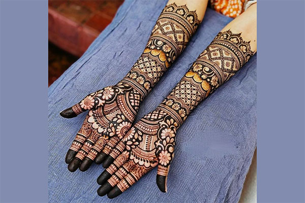 यह डिज़ाइन भी हाथ पर बहुत अच्छा लगता है। इसके लिए, हाथ के बीचों-बीच एक बड़ा फूल का डिज़ाइन बनाएँ। इसके बाद, उंगलियों के ऊपरी हिस्से को मेहँदी से भरें। यह सरल लेकिन आकर्षक डिज़ाइन हाथ पर बहुत अच्छा लगता है।