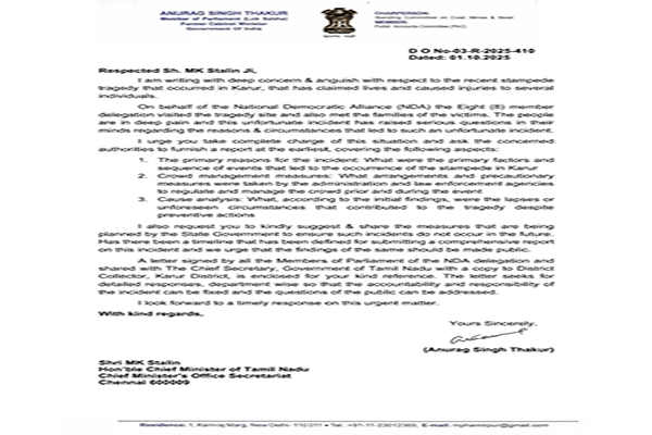 करूर का दौरा (visited Karur) करने वाले बीजेपी-NDA प्रतिनिधिमंडल (BJP-NDA delegation) का हिस्सा बीजेपी सांसद अनुराग ठाकुर ने अभिनेता-राजनेता विजय की रैली के दौरान करूर में भगदड़ की जिम्मेदारी तय करने के लिए तमिलनाडु के मुख्यमंत्री एम.के. स्टालिन को पत्र लिखा है। ठाकुर ने पत्र में कहा, "मैं आपसे इस स्थिति का पूरा जिम्मा लेने और संबंधित अधिकारियों को जल्द से जल्द रिपोर्ट देने का अनुरोध करता हूं, जिसमें ये बातें शामिल हों। घटना के मुख्य कारण: करूर में भगदड़ की मुख्य वजहें और घटनाक्रम क्या था?"