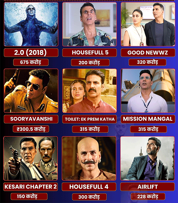 इसके अलावा, केसरी (154.42 करोड़), मिशन मंगल (203 करोड़), हाउसफुल 4 (208.50 करोड़), गुड न्यूज़ (205.14 करोड़), सूर्यवंशी (196 करोड़), ओएमजी 2 (150 करोड़), स्काई फ़ोर्स (134.93 करोड़), हाउसफुल 5 (198.41 करोड़) और जॉली एलएलबी 3 (100.85 करोड़) भी शामिल हैं।