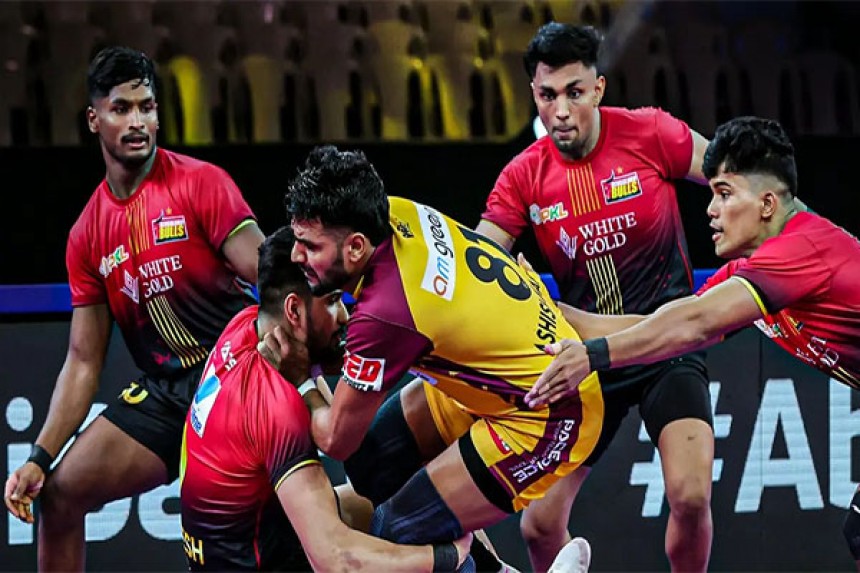 नयी दिल्ली: तेलुगू टाइटंस ने त्यागराज इंडोर स्टेडियम में रविवार को खेले गए प्रो कबड्डी लीग (पीकेएल) के 12वें सीजन के मिनी-क्वालीफायर मुकाबले में बेंगलुरू बुल्स को 37-32 के अंतर से हराकर एलिमिनेटर-3 में जगह बना ली है। इस हार के बावजूद बुल्स के पास आगे जाने का एक और मौका है। अब उसे एलिमिनेटर-2 में पटना पाइरेट्स से भिड़ना होगा, जिसने आज ही जयपुर पिंक पैंथर्स को हराया था।