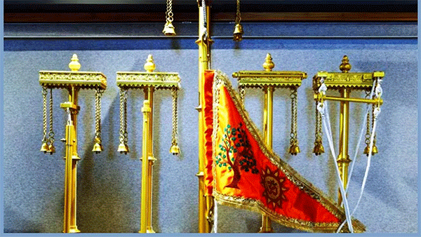 इस झंडे पर तीन निशान हैं। इसमें सूर्यनारायण, ओम और कोविदार वृक्ष को खास जगह दी गई है। यह नारंगी झंडा कई किलोमीटर दूर से दिखाई देगा। झंडा फहराने के कार्यक्रम के दौरान घंटियों की आवाज से अयोध्या नगरी भक्ति से गूंज उठेगी।