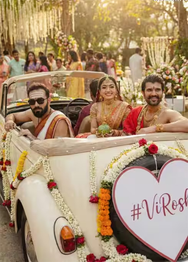 यह फोटो रश्मिका और विजय के वरमाला सेरेमनी की है। नए शादीशुदा जोड़े एक-दूसरे में खोए हुए लग रहे हैं। इस फोटो में रश्मिका और विजय एक विंटेज कार में बैठे दिख रहे हैं, दोनों दूल्हा-दुल्हन के रूप में बहुत खूबसूरत लग रहे हैं। कार के पीछे दिल के आकार के बैनर पर 'विरोश वेडिंग' लिखा है।