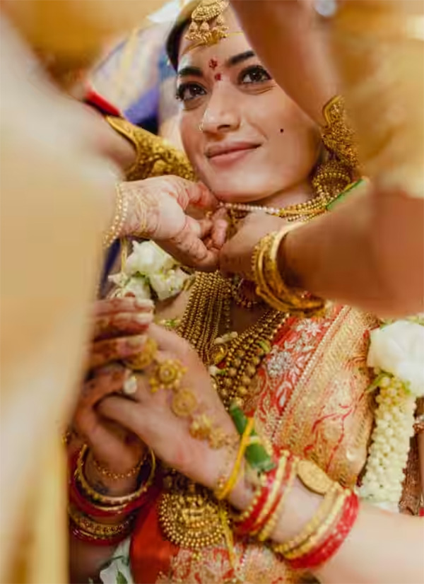 इस फोटो में रश्मिका दुल्हन के रूप में बहुत खूबसूरत लग रही हैं। लाल साड़ी और सोने के गहनों में सजी एक्ट्रेस किसी अप्सरा से कम नहीं लग रही हैं।